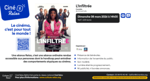 Ciné Relax est un dispositif de Culture Relax. Une séance ordinaire ouverte à tous, avec un accueil adapté où l’on peut bouger, vocaliser, sortir et rentrer, s’isoler si besoin, sans crainte, sans jugement, sans contrainte.